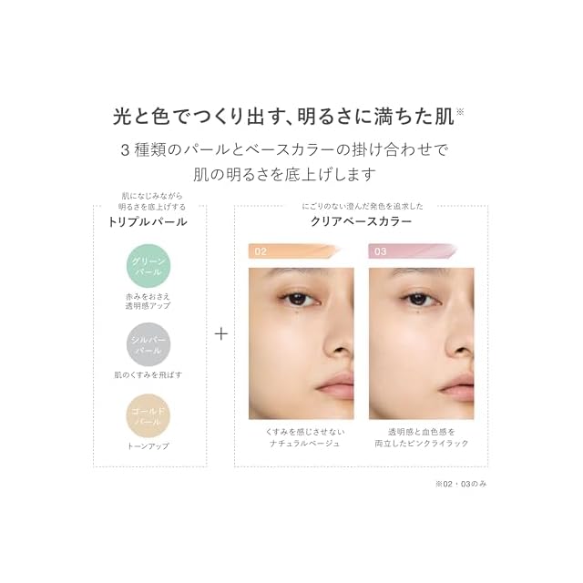 呼吸するような、毛穴レス肌へ。閉塞感のない軽やかなテクスチャーなのに、毛穴や凹凸をフラットにととのえて見えにくくする。毛穴をうめるのではなく、光でぼかしてカバー。5種の保湿成分配合で肌に豊かなうるおいをあたえ、日中のうるおい感をキープしながらも、さらっとしてべたつかないソフトマットな肌に。肌悩みや仕上がりに合わせて選べるこだわりのカラーラインナップ。3種類のパールとベースカラーの掛け合わせによって、肌の明るさを底上げします。~底上げします。**02・03のみ