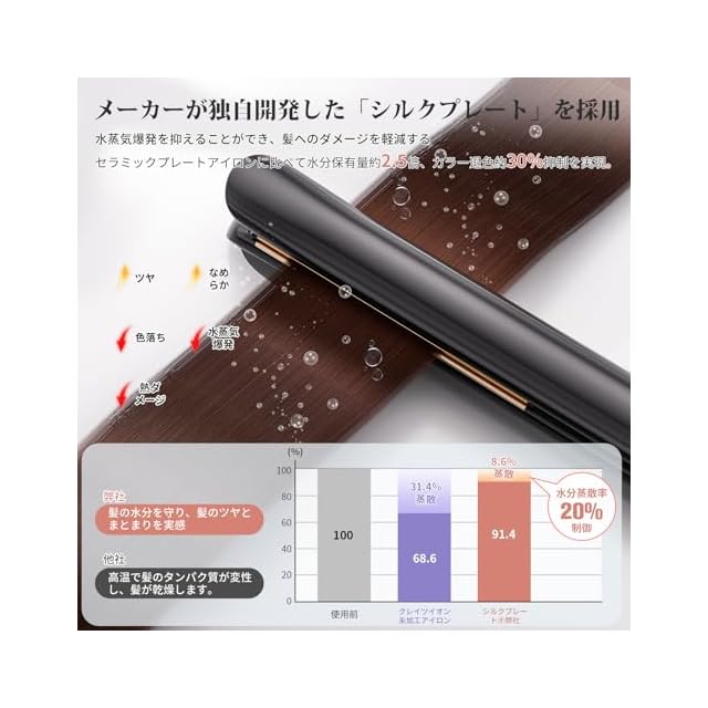 ✅✅【業界初の ミラーチタニウムプレートでダメージを極限まで軽減 】 ヘアアイロンは水・熱・圧のコントロールが、ダメージを起こさないケアに大切な要素。髪に水が残ったまま熱をかけると水蒸気爆発※1が起こり、キューティクルを傷つけます。さらに高温での圧を何度もかけることは、髪がつぶれる原因に。プロフェッショナルは、ダメージを抑えるためにアイロンを動かす速さやテンションを細心の注意でコントロールしながら髪を整えています。弊社の独自技術「ミラーチタニウムプレート 」はプロのダメージ軽減をテクノロジーで再現しました。高密度炭素とヒーターと低反発コートの三層構造が、アイロンの水・熱・圧のダメージを抑えながら、髪を美しく整えます。 ※1 水が非常に温度の高い物質と接鮎することにより気化されて発生する爆発現象のこと。【限定期間キャンペーン】今ご注文いただくと、すぐ「ヘアアイロン」が無料でもらえる!お気軽に説明書の連絡先より弊社までご応募してください!