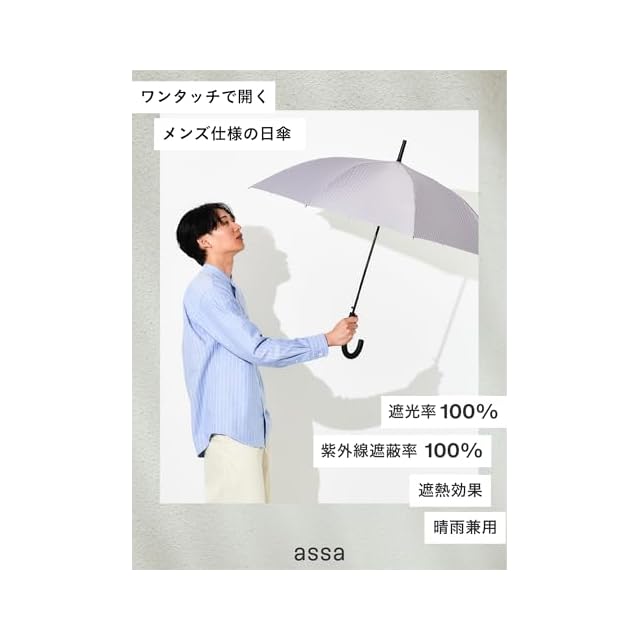 商品名:assa 日傘 メンズ 長傘 大きい 晴雨兼用 男性用 遮熱効果 熱中症対策 遮光 100% UVカット グラスファイバー ワンタッチ ジャンプ傘 FJ (FJ172/グレー)