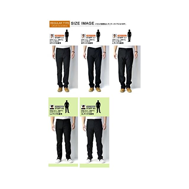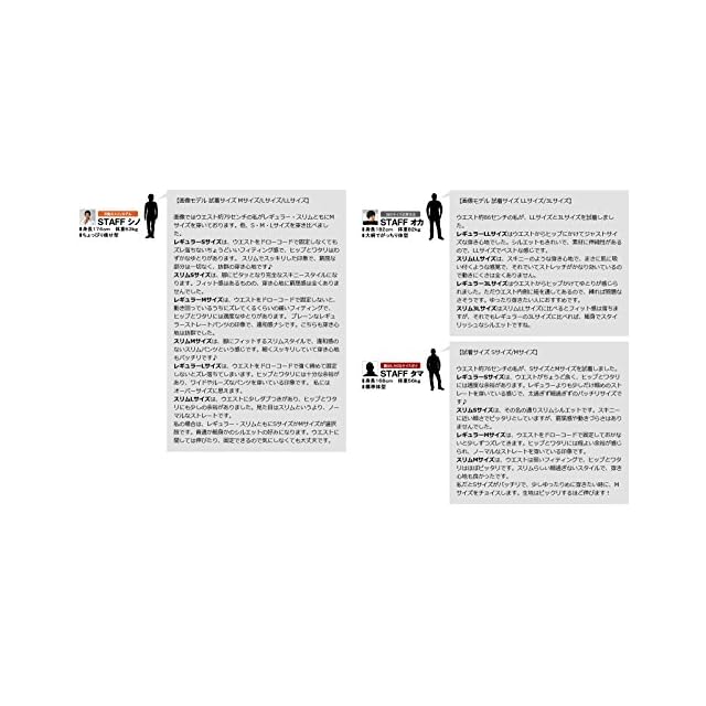 レギュラー:Sサイズ ( 股上:24.5 裾幅:17 ワタリ:26 ウエスト:68-76 総丈:101 股下:76 ) レギュラー:Mサイズ ( 股上:25 裾幅:18 ワタリ:27 ウエスト:76-84 総丈:102 股下:77 )