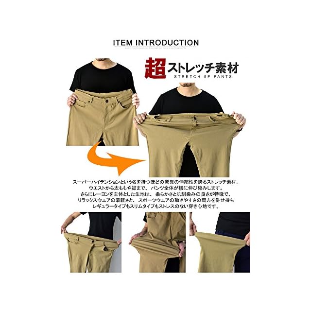 ★選べるシルエット!プレーンなレギュラーストレートと細身のスリムの2タイプがあります。<br/>横方向へ抜群の伸縮性を備えたツイル調生地を使用した、テーパードパンツです。<br/>スーパーハイテンションという名を持つほどの驚異の伸縮性は画像でチェック!<br/>太過ぎず細過ぎずのレギュラーフィットスタイルと、スッキリ細めのスリムの2タイプ。<br/>どちらも脚長効果抜群のテーパードシルエットで、モタつきのないスマートな印象で穿きこなせます。<br/>レーヨンを主体とした生地は、柔らかさと肌馴染みの良さが特徴で、<br/>リラックスウエアの着軽さと、スポーツウエアの動きやすさの両方を併せ持ちストレスのない穿き心地です。<br/>ウエストにもストレッチ性がありフリーサイズな穿き心地♪<br/>また外装からは見えませんが、ウエストの内側にドローコードを装備しており、ベルト要らずで穿いて頂く事も可能です。<br/>一見すれば5ポケットのチノパンツのようで、実は全く別物。超級ストレッチで抜群の穿き心地の良さを誇る1本です。