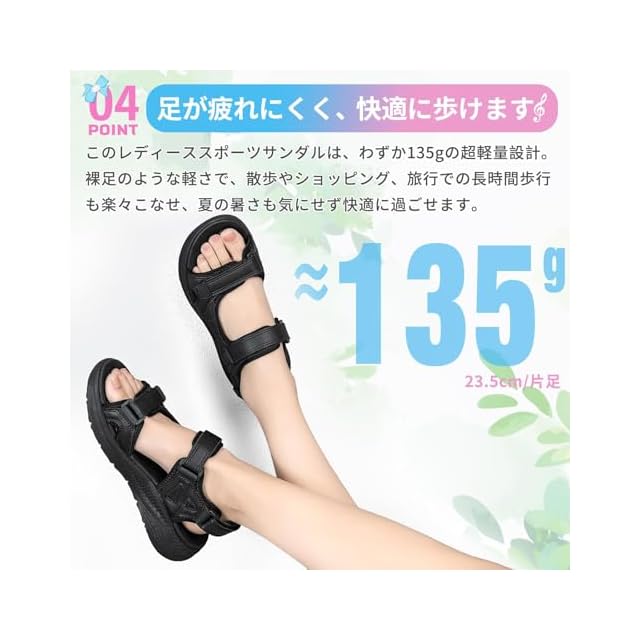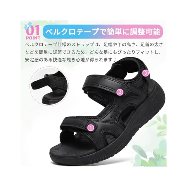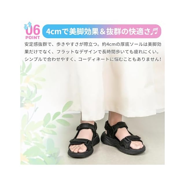 【履きやすい厚底サンダル】接地面から、つま先で約3cm、かかとで約5cmの高さのソールです。約2cm程の高低差の傾斜で負担なく履けるサンダルです。適度な体格比率をアップし、美脚効果を実現、自信を増強します。それぞれの一歩は全て気楽であり思いのままにすることができます。