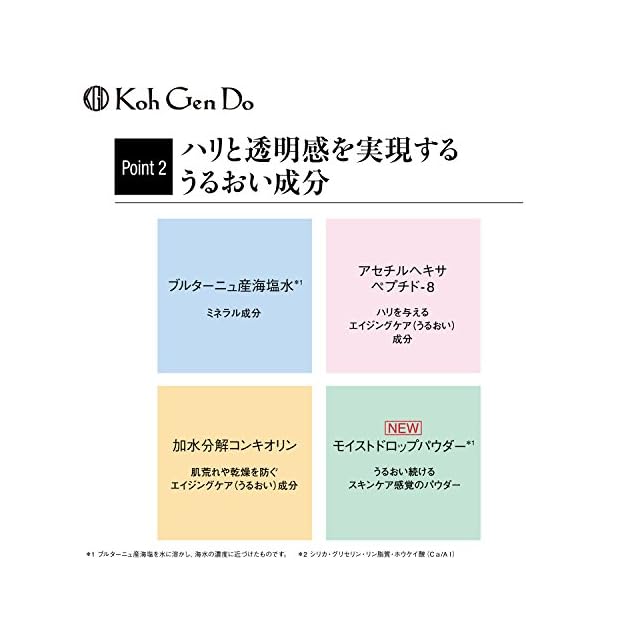 全成分:水、シクロペンタシロキサン、ジフェニルシロキシフェニルトリメチコン、酸化亜鉛、(HDI/トリメチロールヘキシルラクトン)クロスポリマー、イソノナン酸イソノニル、PEG-9ポリジメチルシロキシエチルジメチコン、ペンチレングリコール、PEG-10ジメチコン、マイカ、ジグリセリン、セスキイソステアリン酸ソルビタン、ラウロイルグルタミン酸ジ(フィトステリル/オクチルドデシル)、グリセリン、ホホバ種子油、スクワラン、シア脂、アセチルヘキサペプチド-8、α-グルカン、グルコシルセラミド、グルコシルヘスペリジン、加水分解コンキオリン、海塩、ガゴメエキス、トゲキリンサイ/ミツイシコンブ/ウスバアオノリエキス、ヨーロッパシラカバ樹皮エキス、ゲットウ葉エキス、チャ葉エキス、カンゾウ根エキス、セスキオレイン酸ソルビタン、ステアリン酸、(アクリレーツ/メタクリル酸ポリトリメチルシロキシ)コポリマー、塩化Na、シリカ、BG、ジメチコン、ジミリスチン酸Al、ナイロン-12、タルク、トコフェロール、ラウロイルリシン、ポリメチルシルセスキオキサン、セバシン酸イソステアリル、ミリスチン酸亜鉛、アルミナ、ステアロイルグルタミン酸2Na、リン酸アスコルビルMg、水酸化Na、ホウケイ酸(Ca/Al)、リン脂質、ハイドロゲンジメチコン、フェノキシエタノール、酸化チタン、酸化鉄、水酸化Al