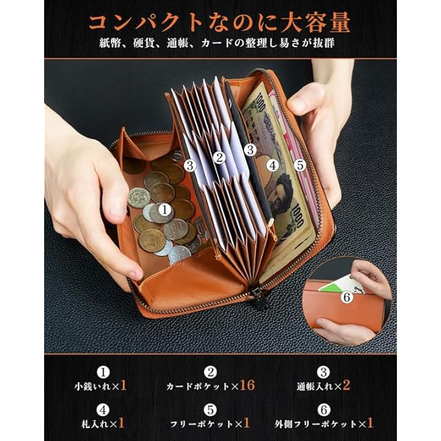 【使いやすいコンパクトサイズ】本革財布を開けると、カードがそれぞれ独立して立ち並ぶので見やすく出し入れしやすい。キャッシュレス時代に最適でカード決済に抜群の実力を発揮する、時短長財布です。「お支払いの動線」を意識し、従来のメンズ長財布を基づいて、「通帳ポケット」を追加し、おろしたお金をしまいつつ、通帳も一緒に持ち運びが出来て便利です。小銭だけではなく、鍵・領収書などの収納にも最適です。外側ポケットにカード入れがあるので、頻繁に使いそうなものをしまっておくことができます。