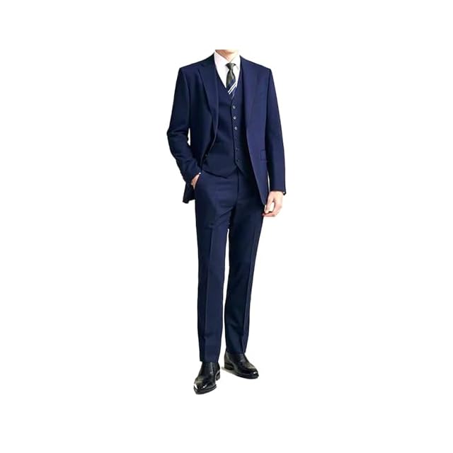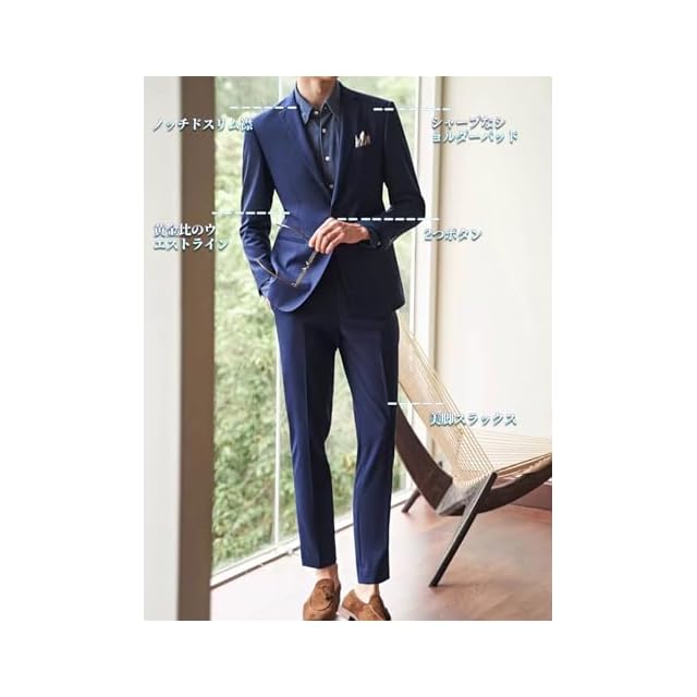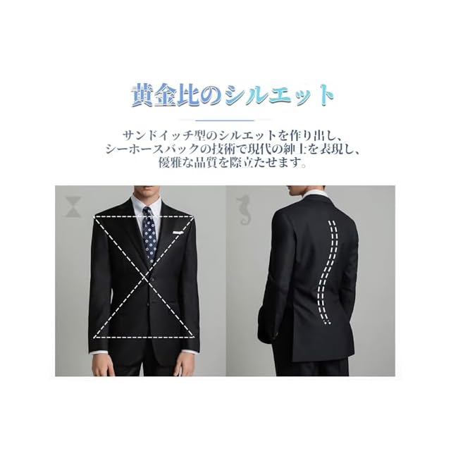 【エレガントなシルエット】このスリムシルエットは、ボディラインを美しく見せ、ウエストを引き締めることで洗練された大人のビジネスマンを演出します。膝下からタイトなスラックスはテーパードデザインで、脚長効果を実現しています。
