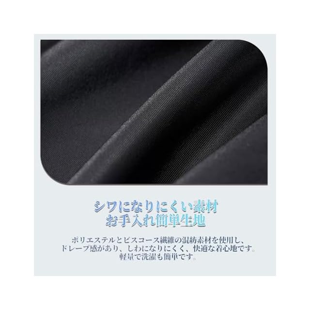 【商品特徴】ポリエステルとビスコース繊維の混紡素材を使用しており、このスーツセットはドレープ感があり、着用時の収縮がなく、しわになりにくい特性があります。優れた肌触りと快適な着心地を実現しており、軽い素材のため、洗濯も簡単で干しやすいです。