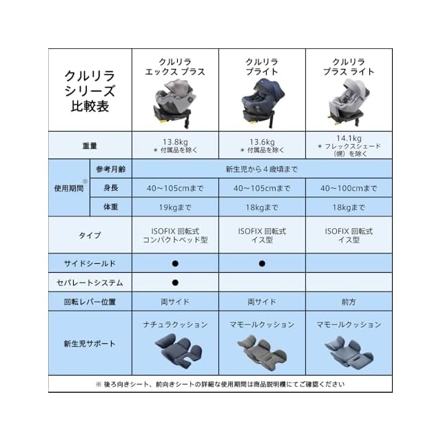 [使用期間] 後向きシート:身長40cm~105cm/前向きシート:身長76cmかつ月齢15カ月以上~105cm (体重19kg以下)