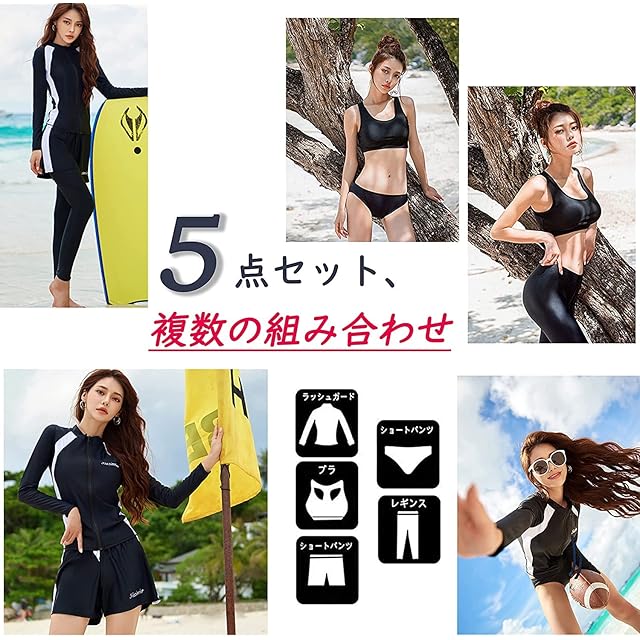 【商品内容】:5点セット:ラッシュガード+ ショートパンツ+タンクトップ+ショーツ+レギンス。