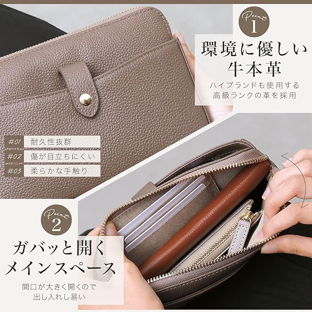 【サイズ・カラー】サイズ: 幅20 × 高さ13 × マチ4.5cm 重さ:約270g カラー:ロイヤルブラック、レトロキャメル、グレージュ、エトープ、スワニーピンク、スカイブルー 【素材】牛本革 シュリンクレザー(ベジタブルタンニン鞣し) 【収納】ポケット:6(外側スマホポケット×1、内側ファスナーメインポケット×1、バックポケット×1、カードポケット×3) 【ご注意】 ※ BLUE SINCERE(ブルーシンシア)が製造・販売する製品は知的財産権の取得を随時行っております。【生産国】バングラデシュ(現地の自社工場にて生産しています)