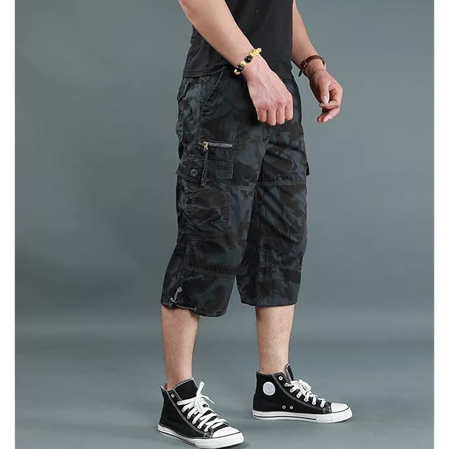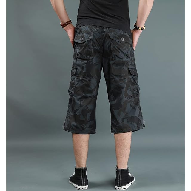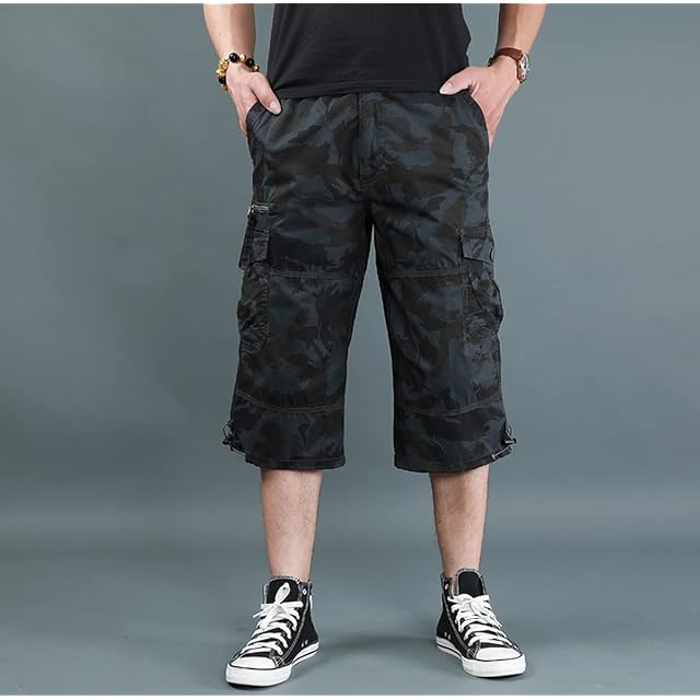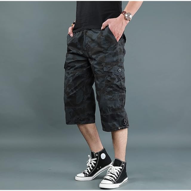 デザイン: ミリタリースタイルのカーゴパンツで、7分丈のカジュアルなシルエットを実現