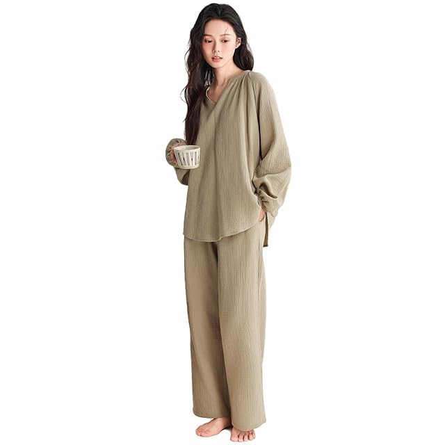 [House Yayoi] パジャマ レディース 2重ガーゼ 綿 長袖 長め ガーゼ ルームウェア 春 夏 かわいい ゆったり ナイトウェア 上下セット 部屋着 寝巻 体型カバー 無地 大きいサイズ 入院 マタニティー 2点セット グリーン 緑 M