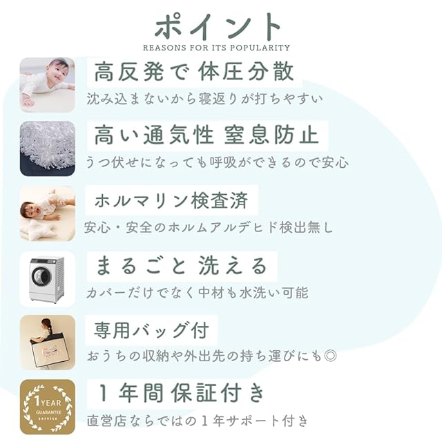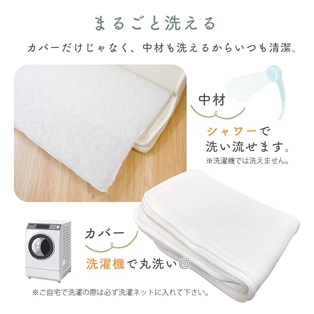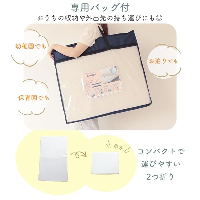 【お家で丸洗いOK】カバーは洗濯しやすく通気性のいいメッシュ素材。ファスナーで簡単に脱着可能だから汚れたら洗濯でき、清潔にお使い頂けます。中材はシャワーでジャブジャブ洗えます。(※外側ケースは、ご家庭の洗濯機でお洗濯される場合ネットに入れてお洗い下さい。タンブラー乾燥はお避け下さい。漂白剤は使用しないで下さい。※中芯は洗濯機で洗えません。必ずシャワー等で水洗いしてください。)【持ち運び楽々♪専用ケース付き】持ち運びに便利なキャリーケースも付いているので、保育園や幼稚園、帰省やお出かけにも持ち運びできるの嬉しいポイントです。60×45cmの2つ折りでコンパクトだから女性でも運びやすい。