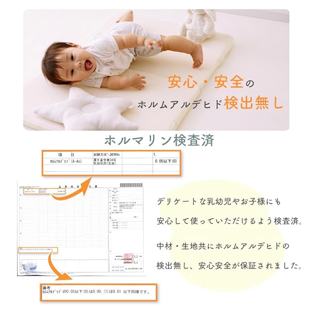 【低ホルマリンだから健康リスク低減で安心】ホルムアルデヒド(ホルマリン)の検出試験を行いましたが、ホルムアルデヒドは検出されませんでした。デリケートで大人よりも化学物質の影響を受けやすい赤ちゃんや、小さなお子様、お年寄りのいるご家庭でも安心してご使用いただけます。