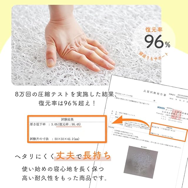 【耐久性/体圧分散】エアインパクトは耐久性が!8万回の圧縮テストを行った結果、復元率はなんと96%を記録!ヘタリにくいから長く快適にお使いいただけます。また、体が沈み込んで1点に体重の負荷がかかるのを軽減し、しっかりと支えてくれるから子どもの柔らかい関節や骨に負担がかかりません。負荷を分散して理想的な姿勢を保ってくれます。