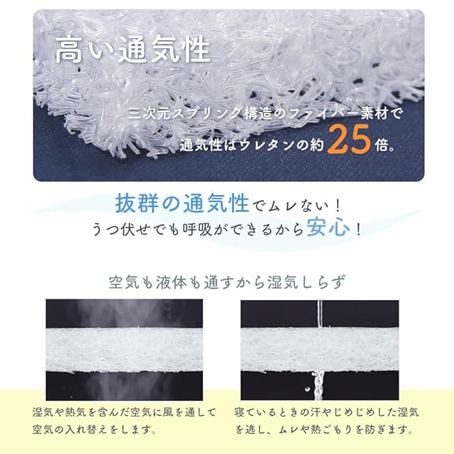【通気性で呼吸しやすい】エアインパクトは、3次元スプリング構造と呼ばれている特殊構造だから通気性はウレタンの25倍!25倍の通気性だから湿気がこもりにくい。うつ伏せになっても呼吸ができるので、安心してお使いいただけます。