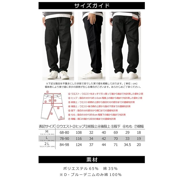 L サイズ ( ウエスト78-90 / ヒップ116 / 前股上34 / 後股上42 / 股下70 / モモ幅33 / 裾幅19 ) ( cm )