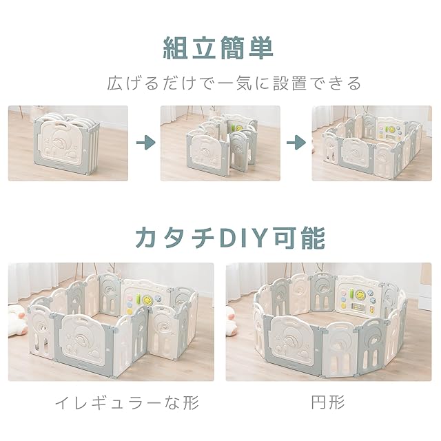 「自由にカスタマイズできる」工具不要でL字型・円形など、レイアウトを自由自在に変更可能。パネルの追加・削除でサイズ調整も簡単なので、お子様の成長に合わせてスペースを広げられます。