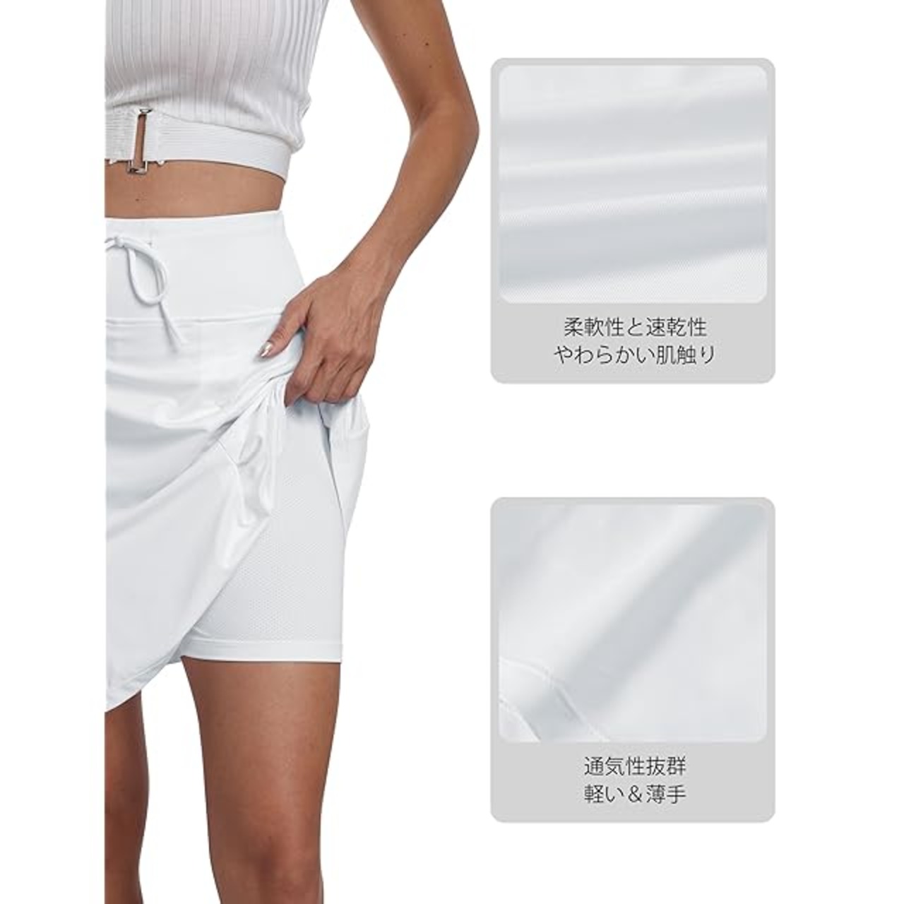 【スポーツスカートの基本機能】ウエスト部分は調整可能な紐付きで、きつすぎず緩すぎない快適な着け心地を実現。さらに、通気性に優れた素材を使用しているため、夏のゴルフウェアとしても蒸れにくく快適です。インナーパンツ付きで安心して動き回れるのも魅力。アウトドアでも室内でも、可愛い印象を損なわない機能性デザインです。