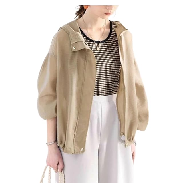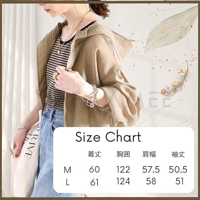 アウター レディース 夏 シアー パーカー ジップアップ トップス<br>シアーの透け感がかわいいレディースライトアウターが新発売! 長袖ですが適度なシースルーで抜け感があるので見た目も重くなりすぎず、春夏の日焼け対策や冷房対策としても活躍すること間違いなし! 薄手のブルゾンなので、秋口にはちょっとした防寒用の上着としても◎ インナーのトップス次第でロングシーズンお使いいただけるジップアップパーカーです。 <br>ドロップショルダーのゆったり袖でしっかり二の腕カバーしつつ、袖ゴムなので腕まくりもしやすいのもうれしいポイント。 裾はドロストになっているのでメリハリもでて、着やせ華奢見えします。 カラーはベージュ・黄緑・カーキの3色展開で、ニュアンスカラーがかわいい!<br>透け感を生かした上品きれいめコーデはもちろんのこと、フード付きなので大人かわいいカジュアルコーデも素敵です。 タイトスカートやワンピース、デニムと合わせるなど、さまざまなコーディネートをお楽しみいただけます。 着るだけでおしゃれさんに見える高見えアイテムなので、10代 20代 30代 40代 50代 60代と幅広い世代の方に手に取っていただきたい1着です。 <br>24<br>■□参考サイズ--- 【 M 】着丈:60cm バスト122cm 肩幅57.5cm、袖丈50.5cm【 L 】着丈:61cm バスト124cm 肩幅58cm、袖丈51.0cm ※採寸は平置きとなり、多少の誤差がある場合がございますので、予めご了承くださいませ