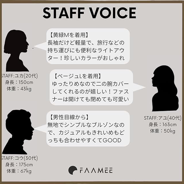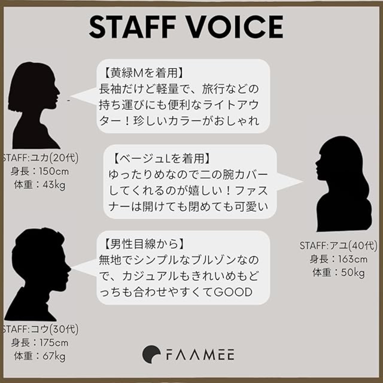 軽量でコンパクトなので旅行やアウトドアなどのお出掛けの羽織りものとしても便利です。 無地&シンプルでなんにでも合わせやすいので着回ししやすく、おしゃれ着からデイリー使いまで幅広くお使いいただけます。 ファスナー付きの前開きでゆとりのあるアイテムなので体型カバーもしてくれますし、妊娠初期の妊婦さんのマタニティウェアとしてもおすすめです。