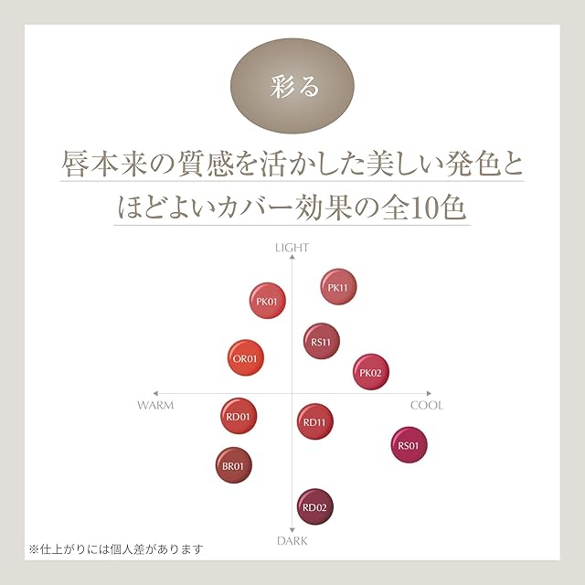 唇本来の質感を活かした美しい発色とほどよいカバー力で、唇はもちろん、肌の美しさも最大限に引き出します。
