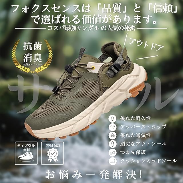 商品名:[フォクスセンス] スポーツ サンダル メンズ 外履き スニーカーサンダル アウトドアサンダル ウォーキング カジュアル 水陸両用 登山サンダル 夏用 トレッキング つま先保護 軽量 防滑 速乾 通気 グリーン 26.5 cm L2512-08