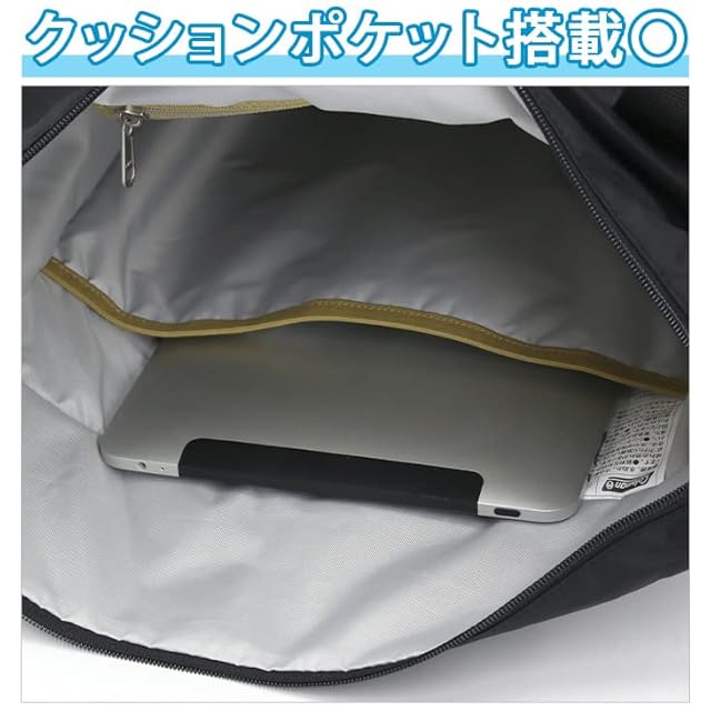 【使いやすい収納機能】トートバッグ形状のため、メインコンパートメントは大きく開き、荷物の出し入れがしやすくなっています。また、内部にはPCやタブレットを収納できるスリーブを備えています。フロントにもポケットがあり、小物などを分けて収納できます。