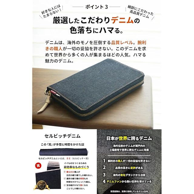 「セルビッチデニム」といえば、ミミ(セルビッチ=耳)。その「耳」と「ロゴの赤タブ」をさりげなくあしらい、ヴィンテージデニム感が高いことも嬉しいポイント。ヴィンテージの王様的存在でジーンズの醍醐味を言われる「色落ち」の風合いや表情は一般的なデニム生地とは比べものにならない。。摩擦でデニムが最高の色落ちをして自分だけのオンリーワンアイテムに育つのも魅力のひとつ。通常ありがちなチープ素材の通帳ケース・通帳入れは使い込むと使用感がハンパなくすぐボロボロなりますが、当商品は、デニム素材のスレ感で逆に味が出て愛着がUP。とく使用する「セルビッチデニム」の経年変化の風合いはよくあるデニム素材とはモノが違う。