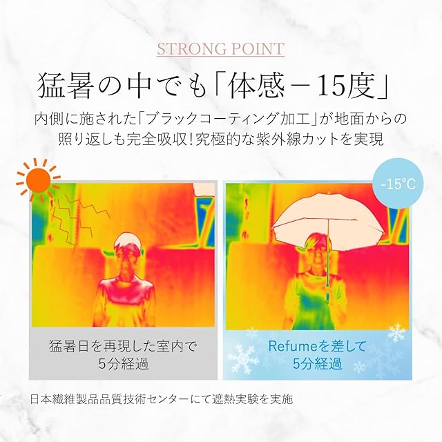 遮光率・UV遮蔽率100%の晴雨兼用で、ブラックコーティングが照り返しも吸収し、赤外線・可視光線も100%カットします。