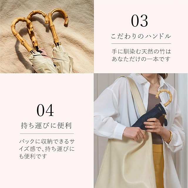 ハンドルにはしなやかなラインで使うことに馴染む天然竹を使用し、上質感とエレガントさを兼ね備えています。