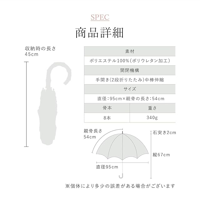 母の日おすすめ商品! ■ブランド名 / 商品名 Refume レフューム / REFU-0001P ■カラー ブラック: BLACK / ベージュ: BEIGE ネイビー: NAVY / クリーム: CREAM ベージュ: BEIGE / ブラック: BLACK ホワイト: WHITE / ベージュ: BEIGE ■素材 / 仕様 付属品生地:ポリエステル 100%(ポリウレタン加工) 生地内側:PUブラックコーティング(100%遮光) 親骨:FRP(グラスファイバー) 開閉機構:手開き(2段折りたたみ) 中棒伸縮 雨晴兼用 完全遮光(遮光率100%) 紫外線カット 照り返しを吸収し赤外線・可視光線もカット 付属品:タッセル ■生産国 CHINA ■サイズ 収納時の長さ:45cm×直径:95cm×親骨の長さ:54cm/重さ:約340g こちらの商品は、メーカー公式の採寸基準で計測しています。