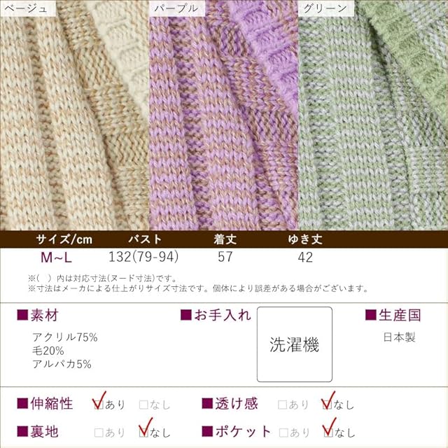 (サイズ展開)M-L (カラー展開)ベージュ・パープル (生産国)日本製 贈り物にぴったり オールシーズンの体温調節に重宝 着たまま生活しやすいショート丈 就寝時も着用OK 薄手で軽くコンパクト チクチクしない柔らかニット 丁寧な縫製の日本製