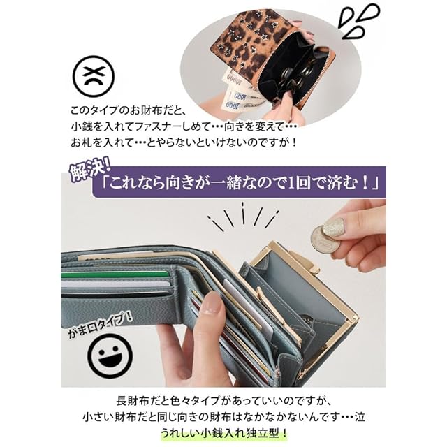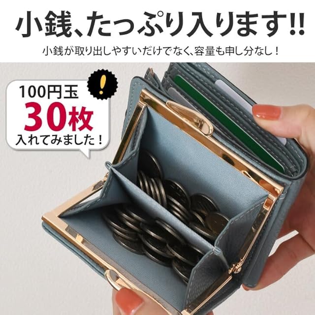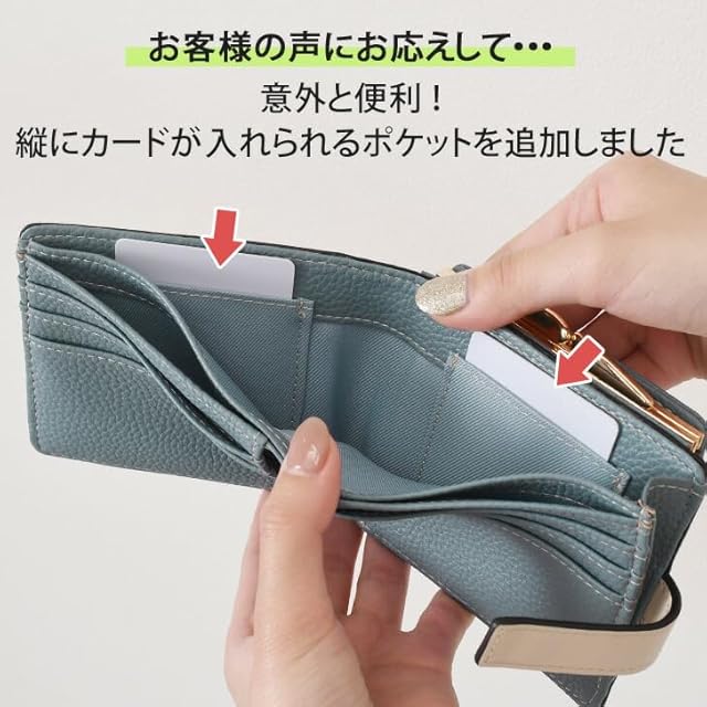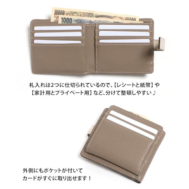 ●当店オリジナルデザイン <br>せっかちさん、ズボラさんにおすすめ! <br>嬉しいポイントがたくさんつまったレジでもたもたしない財布 <br>ベルトデザインが上品な雰囲気 <br>ゴールドのがま口が高級感を演出 <br>小銭とお札入れの向きが同じなのでお会計がスムーズに <br>お札入れには2つに分けて入れられる仕切り付き <br>外側にもカードポケット付きで使う時にすぐ取り出せる <br>トレンドのミニバッグにも入る手のひらサイズ <br>小さめだけど長財布並みの収納力と機能性で使い勝手抜群◎ <br> <br>★staff使用レビュー★ <br>・超せっかちな私…レジでお札と小銭とレシートが同時に渡されてもレジで慌てず一発でしまえてストレスフリー♪ <br>・小銭だけ、カードだけ出したい時も、カード入れ付きの小銭入れが外付けなのですぐ出せるし、意外と容量があるので小さいレジ袋を畳んでしまっています。 <br>・ちょっと大きめのカードは横に入るところに入ります。仕分けがめんどい、出番が少ないカードも何枚かとりあえず入れちゃってます…! <br>・長財布は横幅が小さめバッグに入らないけど、これならばっちり入ります! <br>・小銭もカードもレシートもいつの間にかパンパンになってしまうズボラな私でも整理しやすく、とっても使いやすい◎ <br>・一度浮気して違う財布を使ったら、もたもた&イライラMAX!もうこの形以外、愛せません(笑) <br> <br>※札入れと小銭入れが同じ向きのデザインは当店オリジナル製品です。 <br>※機能・デザイン・形状にかかわる特許出願中。 <br> <br>たくさん 入る 多い 軽量 レジでもたもたしない 超時短財布 通勤 通学 使いやすい 中仕切りあり せっかち ギフト プレゼント 贈り物 お祝い 母の日 敬老の日 誕生日 記念日 主婦 OL ママ 彼女 友だち 友達 母 妻 嫁 娘 転職祝い 就職祝い 昇進祝い 入学 卒業 プチギフト 整理 収納 二つ折 クリスマス バレンタイ ホワイトデー お返し 新生活 新社会人 開運日 金運 厄除け 一粒万倍日 寅の日 天赦日 高級感 高見え ソフトレザー エコレザー フェイクレザー 柔らかい 無地 配色 オシャレ 可愛い 上品 きれいめ カジュアル ベーシック シンプル 高校生 学生 大学生 <br> <br>■サイズ(cm)/縦/横/厚さ/重さ(g) <br>-/9.5/11/3/142/ <br> <br>■仕様:【外側】小銭入れ×1(仕切りあり)、カードポケット×2 【内側】札入れ×2、カードポケット×10 <br>■生産:中国製 <br>■素材:合成皮革 <br>■カラー:グレーベージュ(ほんのりベージュを含んだ薄い茶色)<br>ブルー(くすみ感のある青)<br>アイボリー(黄みがかった白)<br>ブラック(標準的な黒)<br>クリーム(黄みがかった薄いベージュ)