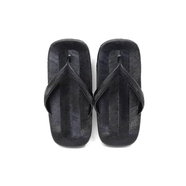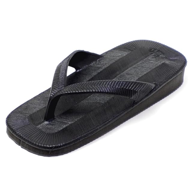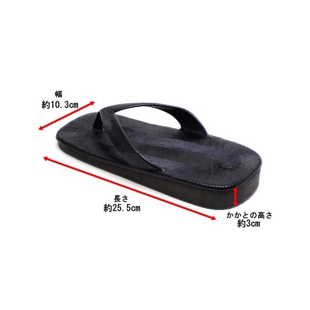 ■雪駄の履き方■<BR> 鼻緒を指の又まで深く入れずつま先でひっかける様にして、かかとを少し出して履くのが「粋」な履き方とされています。<BR><BR> ■サイズ:男性用フリー<BR> ■適応サイズ:25.5~27.0cm<BR> ■カラー:ブラック(黒)<BR> ■アッパー素材:PVC<BR> ■底素材:EVA<BR> ■生産国:日本(MADE IN JAPAN)<BR> ■重さ:片足約230g<BR> ■長さ:約25.5cm <BR>■幅:約10.3cm<BR> ■かかとの高さ:約3cm<BR><BR> ★表記について★<BR> 数値は手作業による採寸ですので若干の誤差が生じる場合がございます。<BR><BR> ★STYLE・USE★<BR> 和装/和服/着物/浴衣/甚平/旅館/居酒屋/祭り/花火大会/イベント/コスプレ/衣装/レトロ/カジュアル/ジーンズ/普段履き/庭履き/お散歩/ビーチサンダル/父の日/紳士/メンズサンダル/ゴムサンダル/ゴム雪駄/ゴム草履<BR><BR> ★APPEAL POINT★<BR> V.I.C(ニシベケミカル)とのコラボ商品/一体成型のインジェクションアッパーで水濡れOK/軽量/軽くてクッション性のあるEVAソール/左右対称デザイン/波型パターンのアウトソール
