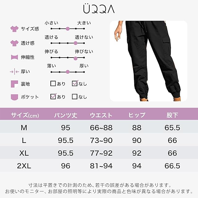 サイズ参考:M パンツ丈95.0cm、ウエスト66.0cm~88.0cm、ヒップ88.0cm、股下65.5cm L パンツ丈95.5cm、ウエスト73.0cm~90.0cm、ヒップ90.0cm、股下66.0cm XLパンツ丈95.5cm、ウエスト77.0cm~92.0cm、ヒップ92.0cm、股下66.0cm 2XLパンツ丈96.0cm、ウエスト81.0cm~94.0cm、ヒップ94.0cm、股下66.5cm 寸法は平置きでの計測のため、若干の誤差がある場合があります。また、一般的なお洋服よりも若干小さめとなっております。お使いのモニター、お部屋の照明等により実際の商品と色味が異なる場合があります。