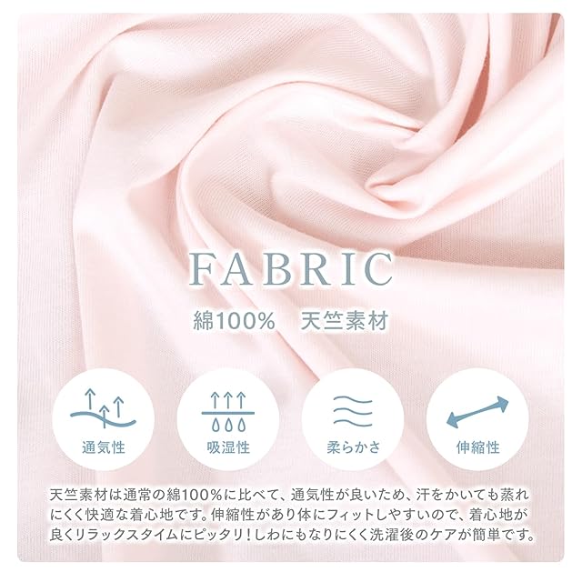 【綿100% 天竺素材のパジャマ】 通気性と吸湿性に優れた天竺素材を使用した綿100%のパジャマが登場。天竺素材は、独自の編み方により、汗をかいても蒸れにくく、快適な着心地を提供します。薄手でありながら、春夏の暖かい季節から秋冬の重ね着まで、通年で活躍する一枚です。