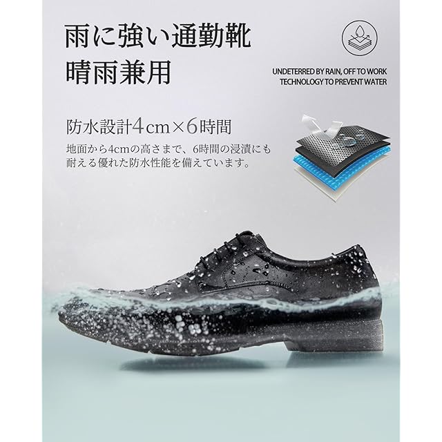 【水に強い通勤靴】地面から4cmの高さまで、6時間の浸漬にも耐える優れた防水性能を備えています。防水性はもちろんのこと、歩きやすく疲れにくい設計で、毎日の通勤に最適です。雨の日も頑張るあなたの足元をしっかりサポートします。