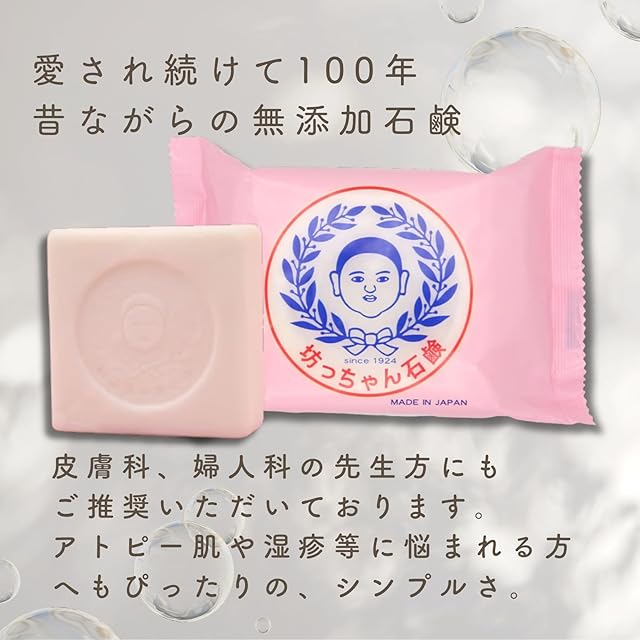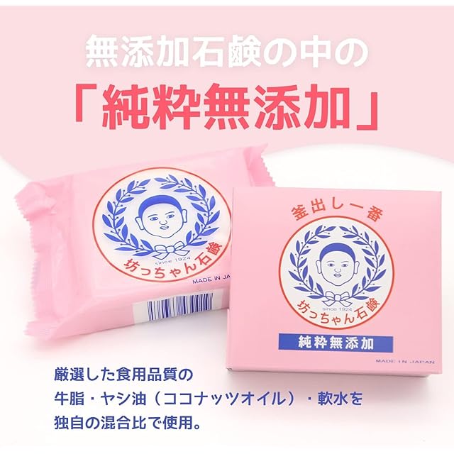 【“無添加”を証明する石鹸】 市販の“無添加風”とは一線を画す、香料・着色料・防腐剤・蛍光剤・酸化防止剤すべて無添加。肌トラブルを抱える方が“最後にたどり着く石鹸”として、産婦人科・皮膚科でも推奨。本物の無添加を使ったこと、ありますか? 【赤ちゃんも、アトピー肌も。誰よりもやさしく】 化学成分ゼロの石鹸だから、肌に余計なものが残らない。生まれたての赤ちゃん、肌の弱いお年寄り、アトピーや乾燥に悩む方でも毎日安心。「洗う」ではなく「守る」。石鹸にできる最大限のやさしさを形にしました。 【食べられるほどピュアな素材だけ】 原材料は、、厳選した上質な牛脂とヤシ油(ココナッツオイル)、軟水のみ。すべて食用グレード。化学添加物はゼロ、余計な成分は一切なし。“肌に触れるものは、食べられるレベルで”。それが100年以上変わらぬ坊っちゃん石鹸の信念です。 【機械で作れない、“人の手だけ”の石鹸】 枠練り製法+60日熟成。自動化を捨ててまで、職人が手で仕上げる理由。それは“本物の無添加石鹸”をつくるには、この手間が必要だから。大量生産では実現できない、泡立ち・持ち・やさしさのすべてが詰まっています。 【選べる特典付き|最初の1歩を、感動に】 初めての方にも感動を。美容保湿に特化した濃密泡を生む「泡立てネット」が付属。まずはこの10個セットで、本物の無添加体験を。使えばわかります。「これしか使えない」と言われる理由が。