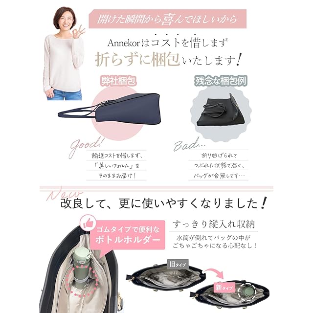 【類似品にご注意ください】見た目の画像は同じような商品でも、作る工場や品質・対応は全く違います。すぐに壊れる・色が画像と違う・連絡をしても返事がない等色々なトラブルがございますので、販売業者は慎重にお選びくださいませ。<br> 【1年間で15,000個以上を販売したバッグ】持ち手部分の質・ポケットの深さ・梱包状態など、「ベーシックモデルの本質」をイチから見直した新作バッグです!<br> 【大容量バッグ】A4サイズが楽々入る大容量バッグで中はポケットで仕切られており使い勝手バツグン!雨の日でも安心の生活防水仕様です!サイズ:高さ28cm 横上辺42cm 横下辺33cm マチ15cm<br> 【折り目を付けずに】つうじょうこういった製品の多くは輸送コストの問題で「底部分を折られて潰れた状態」でされており、これを何とか改善したいと思い、弊社は輸送コストを倍かけて「折らずにお届け」をさせていただきます!<br> 【充実のサポート体制】日本企業でのお買い物はアフターケアも充実。何かございましたら、弊社日本人スタッフが迅速に対応させていただきます。