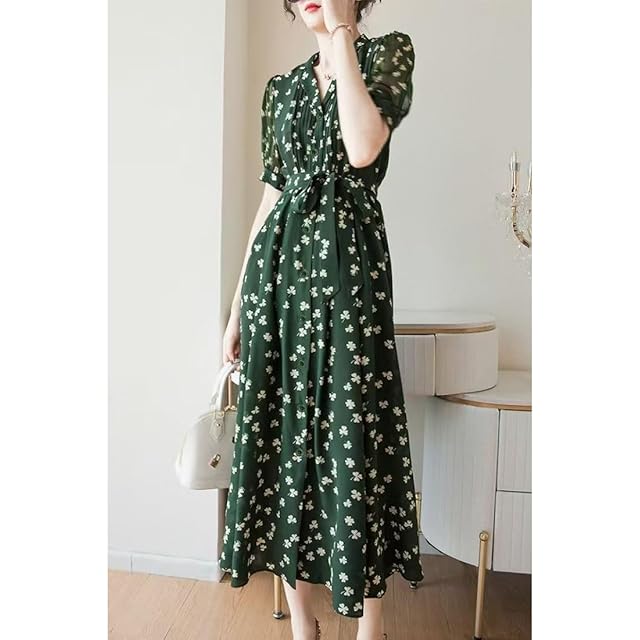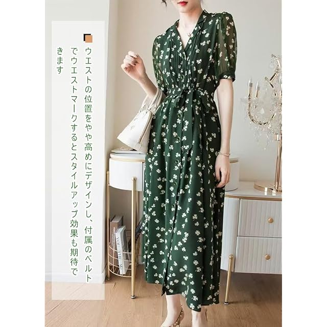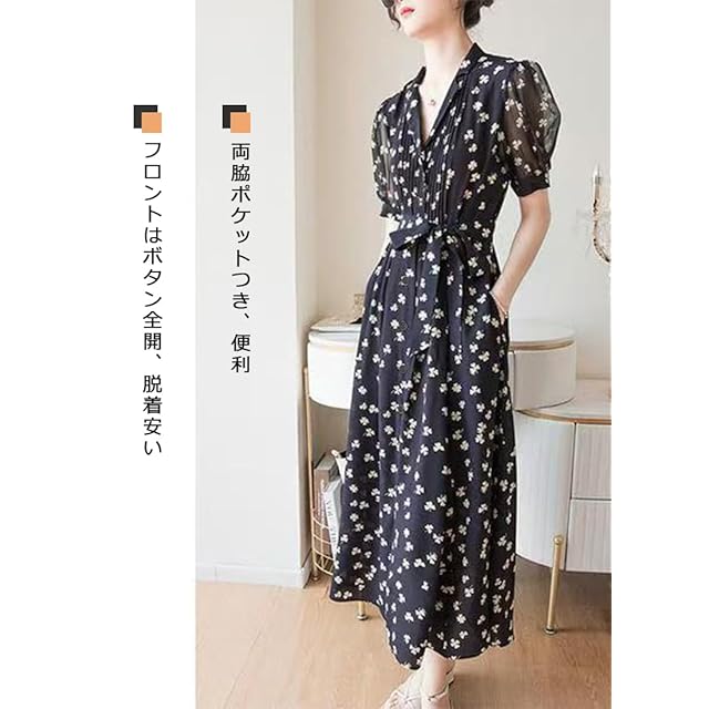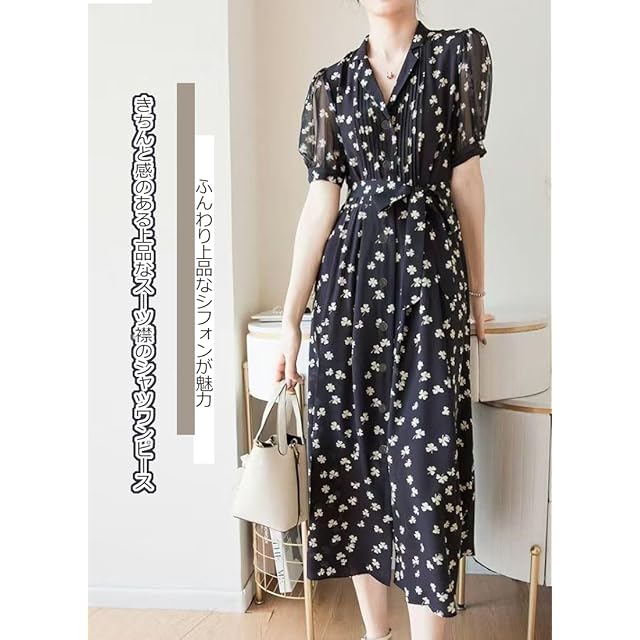 [Collecala] ワンピース レディース 夏40代 50代ドレス 女性柄上品どれす 品質よい ラペル襟Vネック なつ半袖スーツ 黒総柄 ウエストリボン 細腰サマーワンピース | Trend Design BASE店