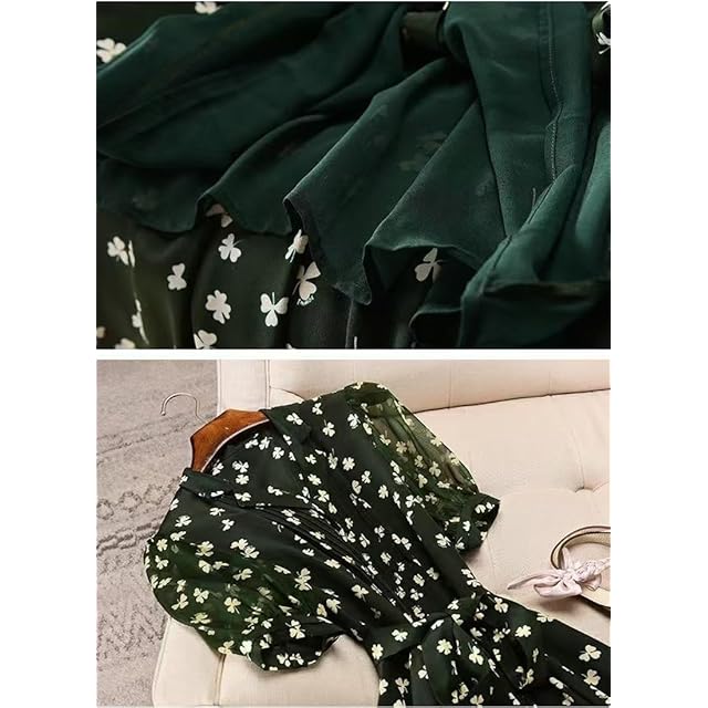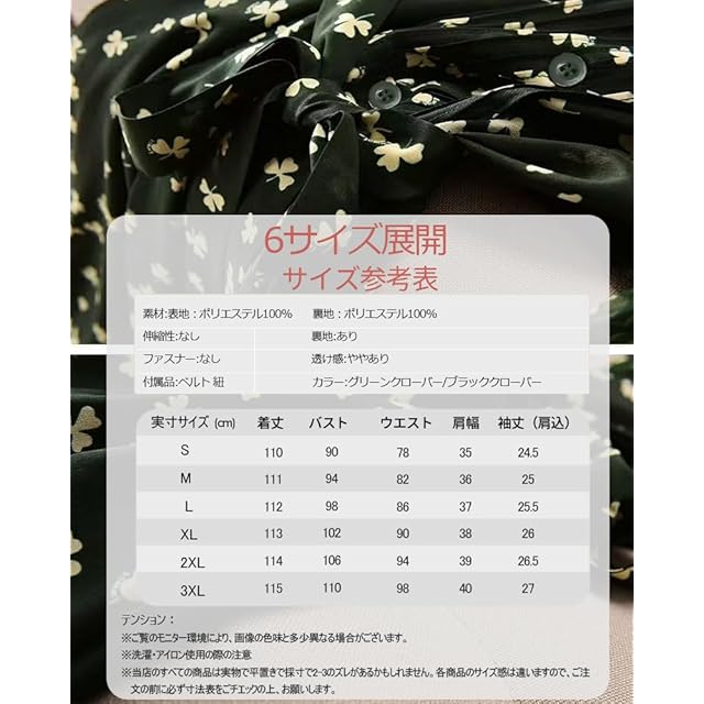 全身がクローバーの小柄プリントを施し、さらっとした肌触りの程よい透け感のあるシフォン生地を利用され、揺れるたびに可愛いシルエットに。裏地は肌に触れるので、柔らかく着心地の良い素材を採用されております。