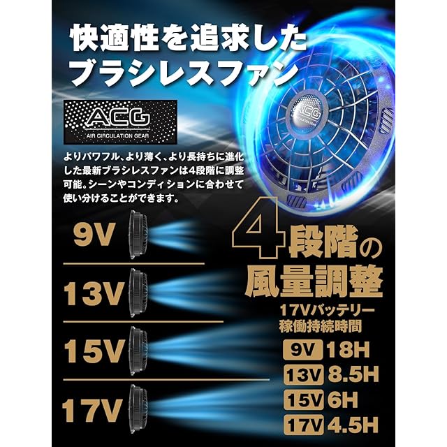 【パワフルで進化した最新ブラシレスファン】Duerfusaのファンバッテリーセットには、ボタンひとつで4段階に調整可能な最新ブラシレスファンがセットされています。よりパワフルで強力に進化したこのファンは、最大17Vで設定すると猛暑の夏でも快適に過ごせる風量を提供します。様々なシーンに対応できる調整可能な空調ウェアの完成です。