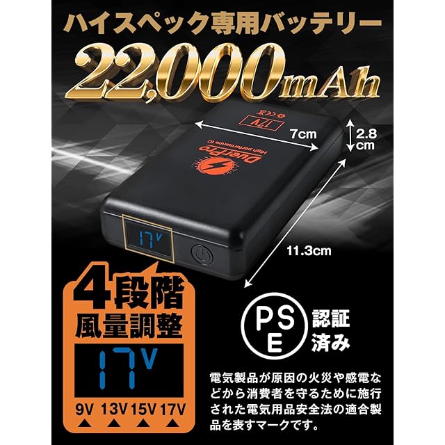 【17V22000mAhのPSE認証バッテリー付き!】Duerfusaのファンバッテリーセットには、17V22000mAhのパワフルで長持ちするPSE認証済みの専用バッテリーが付属しています。4段階に調整可能な風量を実現し、高性能なバッテリーです。空調ウェア専用に設計されたバッテリーなので、故障も少なく長くご使用いただけます。操作方法の詳細は付属の取り扱い説明書をご確認ください。