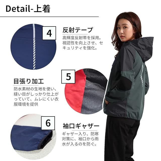 【防風・防寒・反射テープ】①フードはひも付きのデザイン。自分の好みによって、フードを頭に合わせる事ができます。フードの両側にゴムひも付き、着こなしでのバランスや風でのばたつきを抑制。袖口は絞られており、防風と防寒性能を高めます。②レインコートの表裏に反射テープを採用し、夜間の視認性と安全性を高め、夜間の安心・安全な使用を可能にしています。