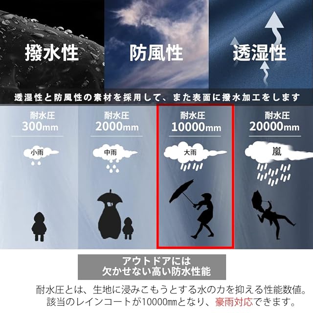 【驚異の撥水・透湿】このレインウェア レディースは外出先や旅先での悪天候に対応できる撥水加工を施した軽量レインウェア。生地はポリエステルとTPUコーティング素材で、防風性も併せ持つため、急な冷え込みが予想される旅先でも活躍。耐水圧10,000mm、透湿度5,000g/m2・24hと、急な雨も安心。撥水機能によりレインウェアとしても利用でき、天候・シーンを選ばず着まわしできる便利なアイテムです。