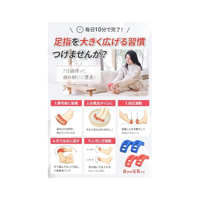 足指げんきくんを装着することで、普段の生活では鍛えにくい筋肉にアプローチして足指を広げます。 足指を広げることで身体のバランスが整いやすくなります。