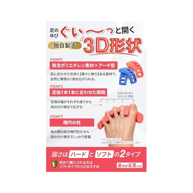 硬さと弾力性のある発泡ポリエチレン素材で足指をしっかり広げます。 表面はエンボス加工を施しており、滑りにくい素材です。
