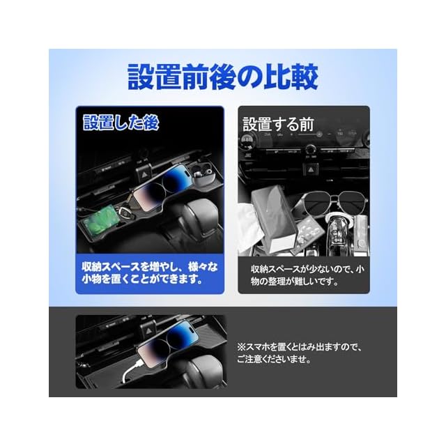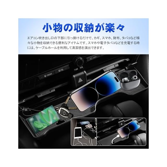 【小物の収納が楽々】エアコン吹き出し口の下部に引っ掛けるだけで、カギ、スマホ、財布、タバコなど様々な小物を収納できる便利なアイテムです。スマホや電子タバコなどを充電する時には、ケーブルホールを利用して清潔感を演出できます。
