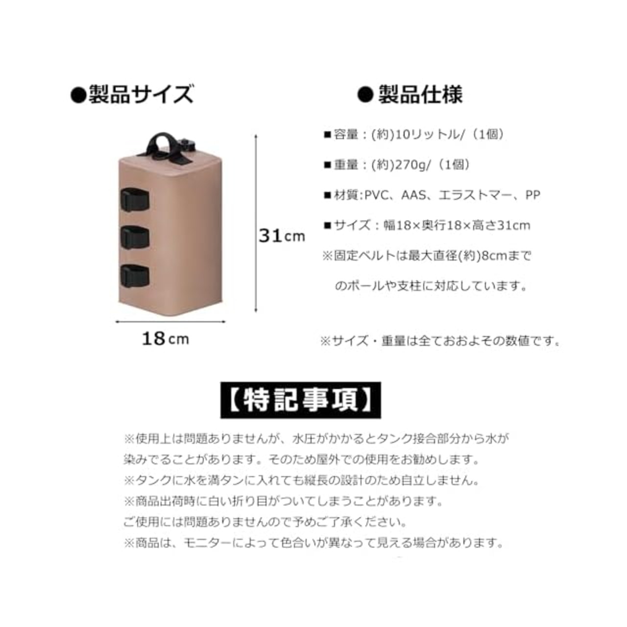 ■サイズ(約):長20×幅20×高さ32cm■適合ポールサイズ:(約)φ15mm~φ55mm■色:カーキ/ブラック■入数:4個セット■材質:PVC、AAS、エラストマー、PP■セット内容:ウェイトバッグX4、漏斗X1、収納バッグX1