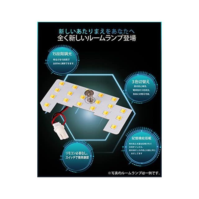 【3色カラーに切替可能&15段階調光機能がついたLEDルームランプが新登場】:明るすぎると言う方にも朗報です。カラーだけでなく明るさもお好みに調整可能!1色ずつ20%/40%/60%/80%/100%で調整でき、シーンによってスイッチでお手軽に変更できます。落ち着いた雰囲気を演出するLED照明を設定。夜間、足元に小物を落とした際などに、簡単に見つけ出せる照度を確保しています。家族に喜んでもらえる”電球色”暖色 ”暖かみのあるルームランプLEDです。